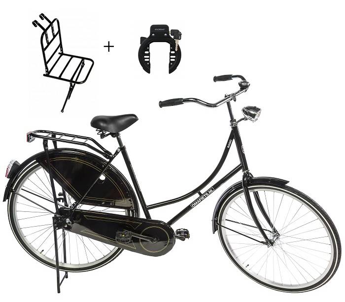 Leicht Fahrräder auf den Omafiets ein komfortables Erlebnis. Durch eine gemütliche moderne Sattel und feinen weichen Griffe Radfahren auf der oma ist auch sichern die Front-und Heckleuchten, Front-und Rückstrahler und einen weißen Streifen auf den Reifen. Die Omafiets kommt mit einer Glocke und einem zusätzlichen Steckplatz. Der Leiterträger ist praktisch, um in der Lage, einen Korb zu legen sein.
