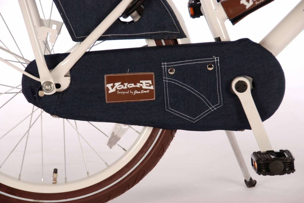 Model 2014 Exclusief bij omafiets.nl, de Oma Designed By Jan Smit kinderfietsenlijn. Een moderne stoere omafiets met echte Jeans spijkerstof. Zelfs de regenbeschermers zijn gemaakt van Jeans, met een echte achterzak erop. Extra opgeblazen frame. Kunstlederen bruine handgrepen, bruin verend zadel en extra brede bruine banden. Batterij voor en achterverlichting, slot. Met nieuw ontworpen super stevige bagagedrager en voordrager. In een frisse witte kleur. Op deze omafiets wil elke jonge dame wel naar school fietsen.